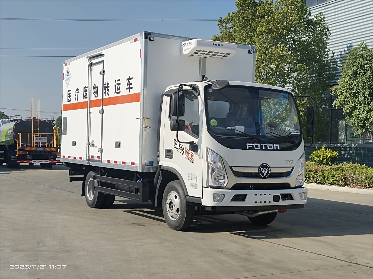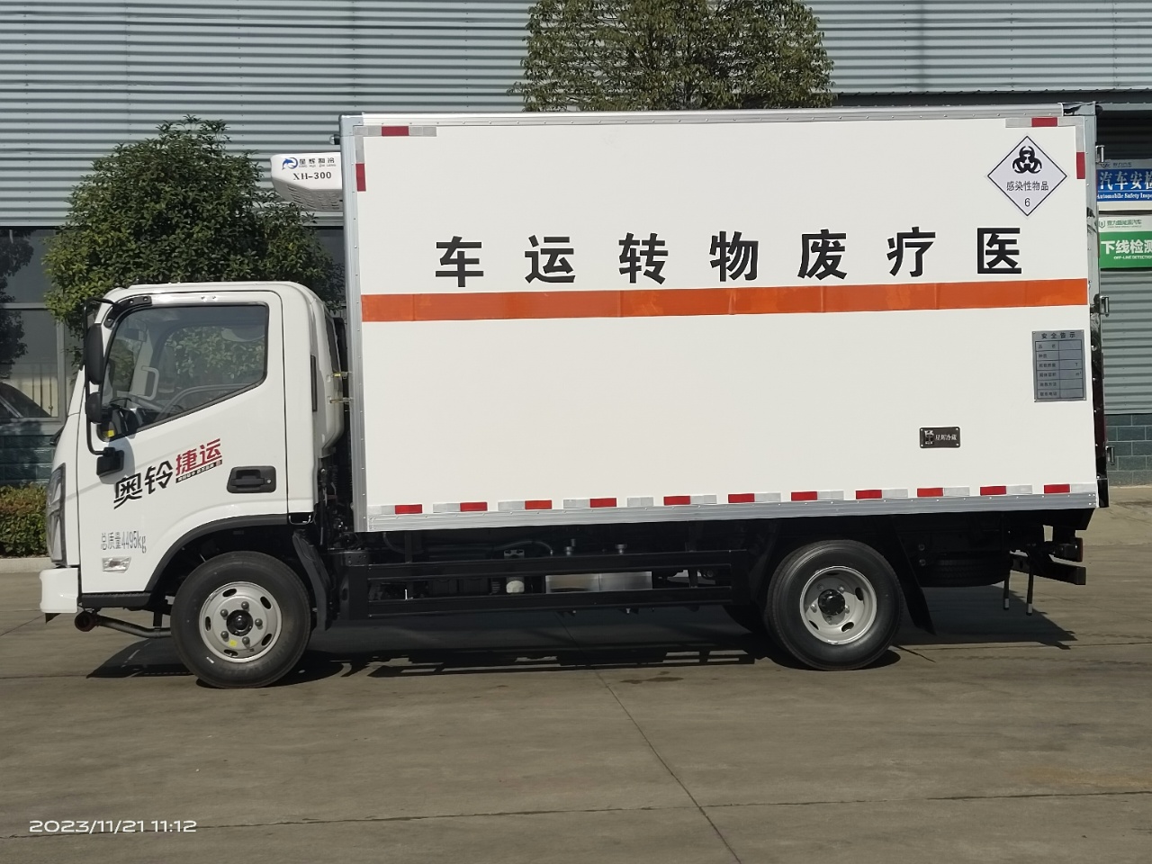 福田奧鈴國六醫療廢物轉運車選用的是福田奧鈴危險品專用底盤,國六排放標準,廂體尺寸:4060*2100*2100mm,可選云內150馬力發動機或康明斯131馬力發動機,帶5檔變速箱,7.00鋼絲胎,帶空調,方向助力,中控鎖,電動車窗,排氣管前置,ABS限速,車道偏離預警,前碰撞預警。根據醫療廢物轉運車要求,該車外板采用玻璃鋼,中間填充隔熱阻燃材料,廂內全部為不銹鋼內板,尾部帶不銹鋼門內門(選裝側門),帶-5度冷藏機組。上裝工具包括靜電帶,滅火器,防火帽,三角頂燈。國標反光標示及警告標志。匹配有不銹鋼五金件,紫外線殺毒燈,噴霧消毒壺和噴淋裝置。